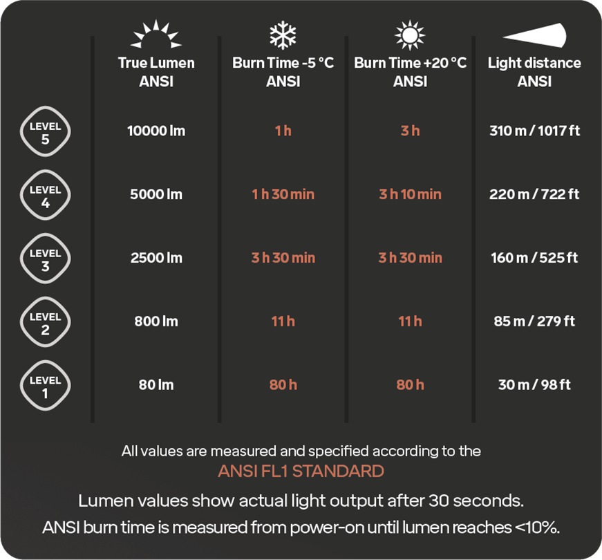 There are crucial factors that affect how much light you get out of a headlamp, and also for how long. That's why there are tables on our packaging that show the burning time of our headlamps.