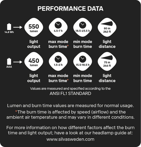 550 lm / 4.5-7 h burn time / 80 m (264 ft) light distance