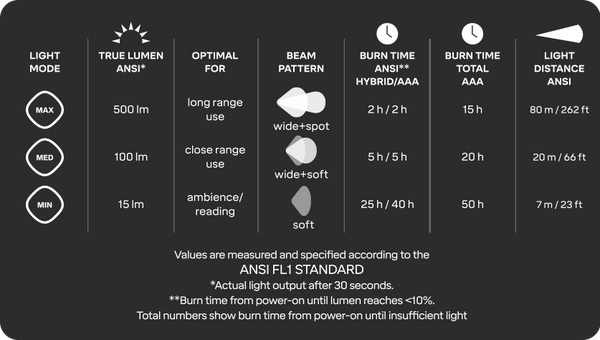 • Min mode: 15 lm / 40 h burn time / 7 m light distance