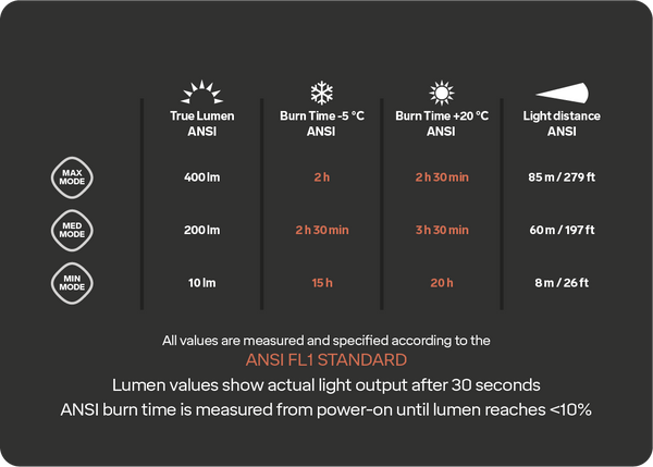 400 lm / 2-2.5 h burn time / 85 m (279 ft) light distance