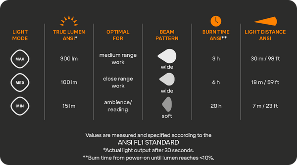 • Max mode: 300 lm / 2,5-3 h burn time / 30 m light distance