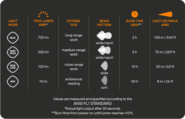 • Max mode: 700 lm / 2-3 h burn time / 105 m light distance
