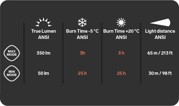 350 lm / 3 h burn time / 65 m (213 ft) light distance