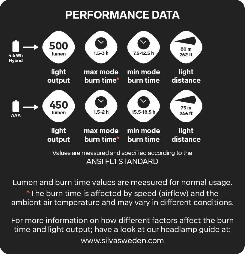 500 lm / 1.5-3 h burn time / 80 m (262 ft) light distance